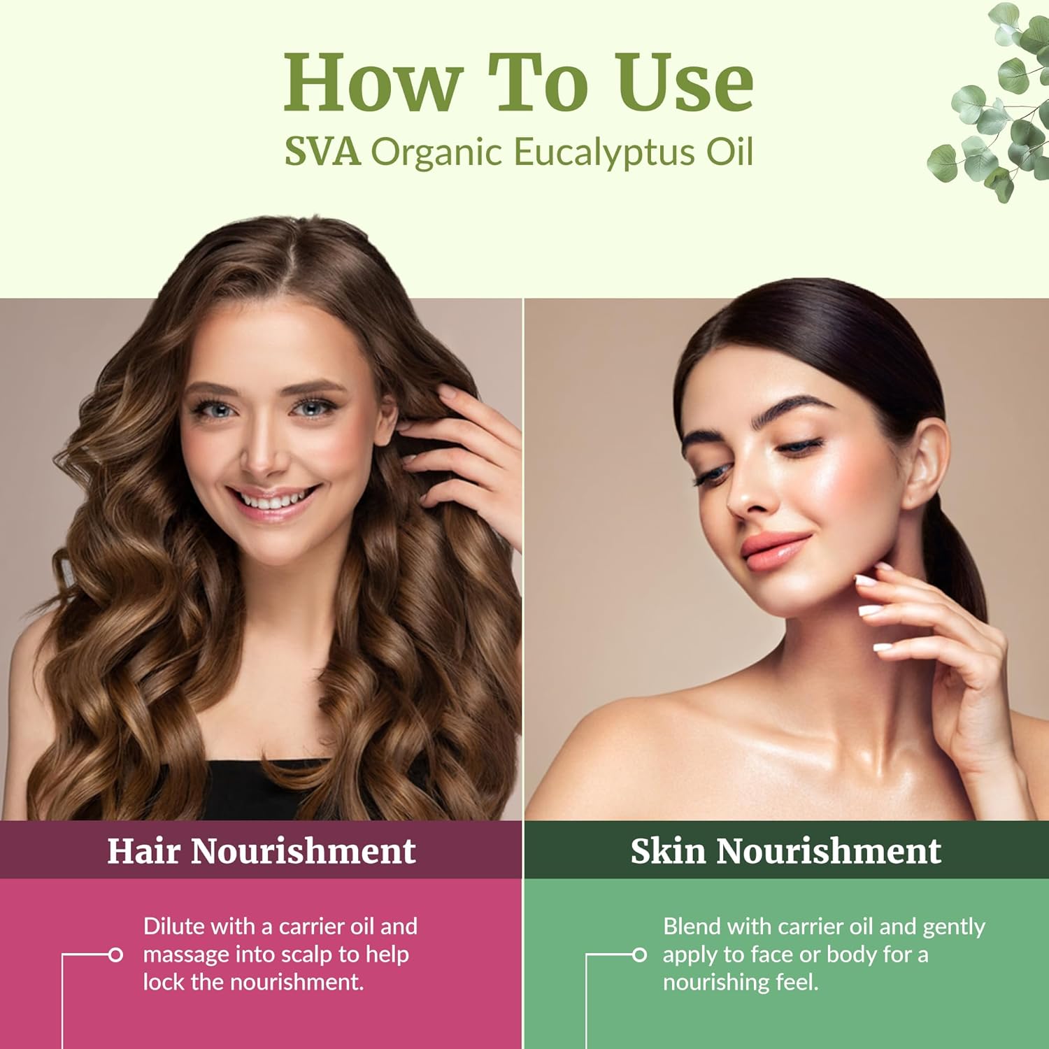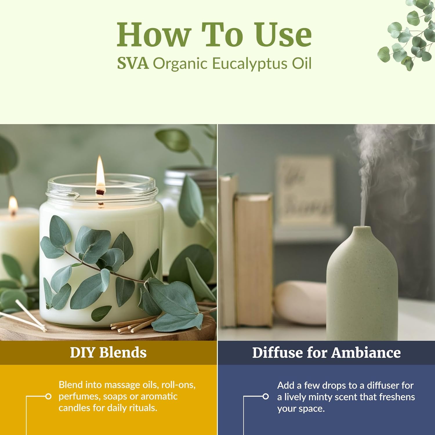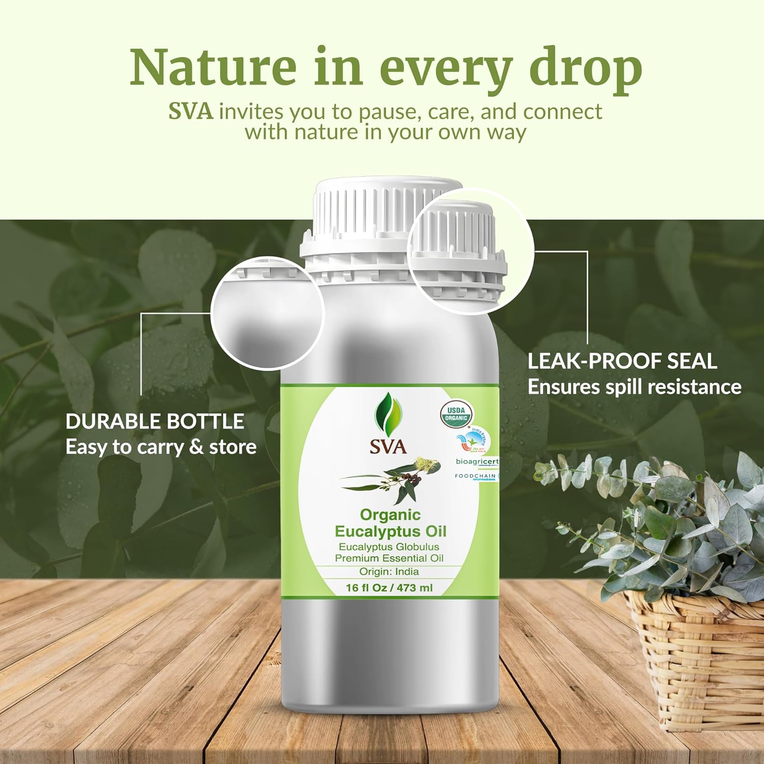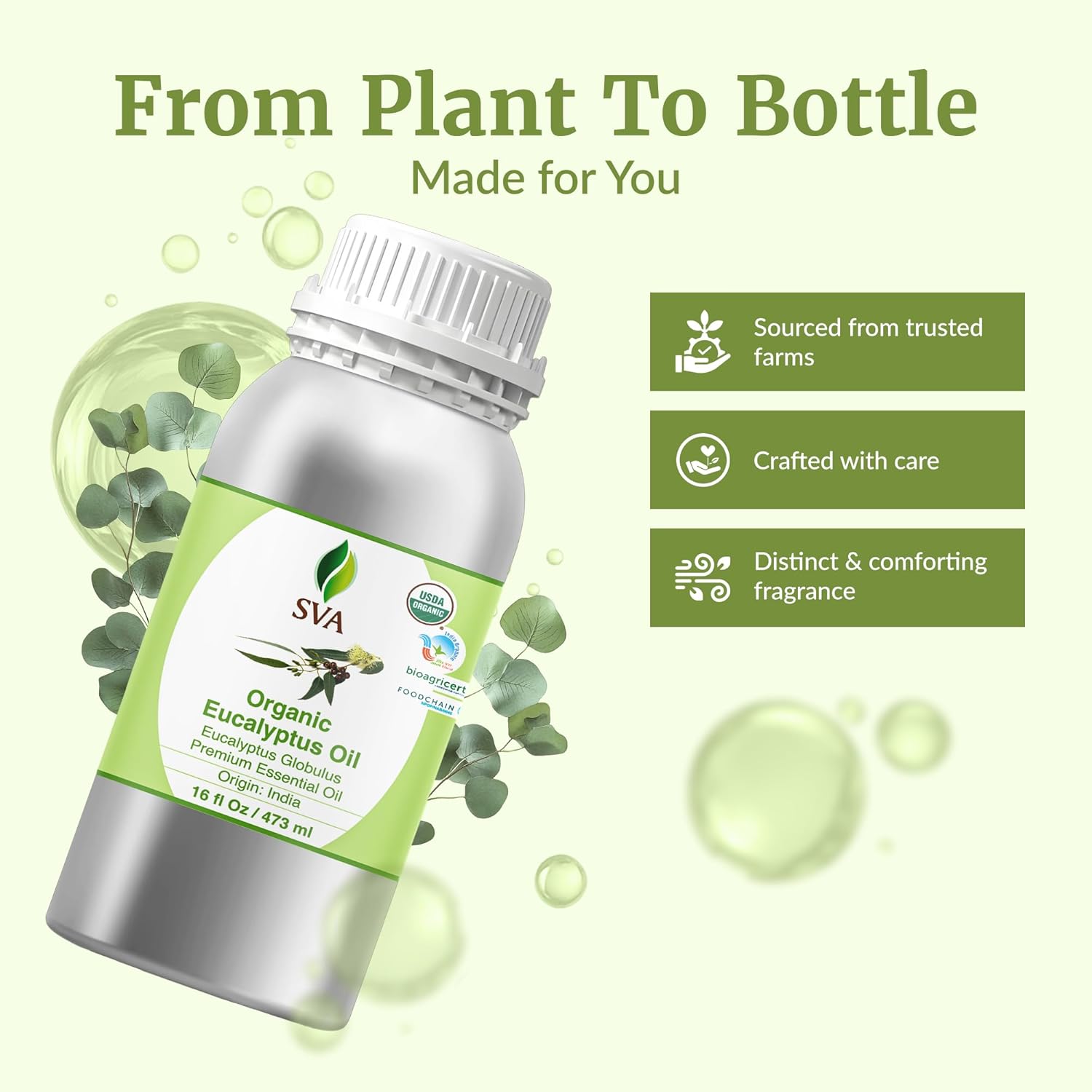 SVA Eucalyptus Essential Oil Organic u2013 16 Fl Oz u2013 100% Natural Organic Eucalyptus Oil for Hair, Face, Skin Care, Diffuser, Aromatherapy, Scalp, Body Massage, Soap and Candle Making
